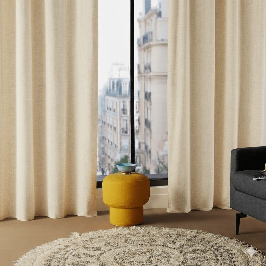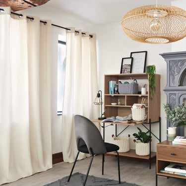 LILOU is een elegant en modern lichtdimmend gordijn in een zachte ivoortint die de ruimte een rustige en stijlvolle uitstraling geeft. De zware stof dimt het licht en biedt privacy, terwijl het gordijn mooi valt en een exclusieve look creëert. Dankzij de geïntegreerde metalen ringen kan het eenvoudig aan een gordijnroede zonder boren worden opgehangen.